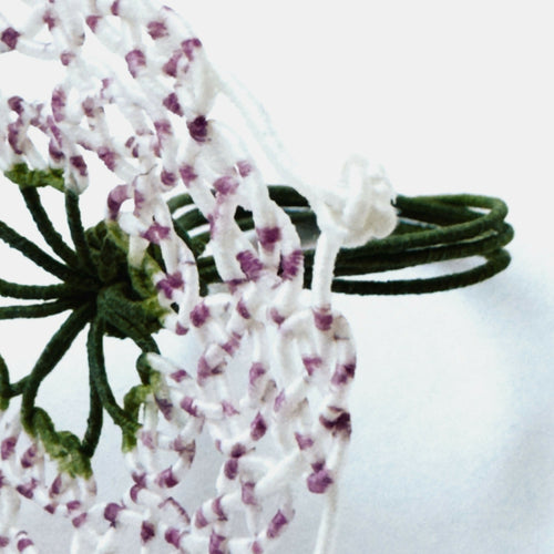 Je crée une matière textile légère, faite à la main à partir d'une technique de nœuds coréens, que j'applique à la création de sculptures, parures et objets décoratifs. « L’emploi du fil noué me permet de jouer de l’ombre et de la lumière, des surfaces planes et des profondeurs, des vides et des pleins, révélant ainsi l’architecture essentielle de l’objet textile, lui donnant un caractère flottant, translucide, aérien »